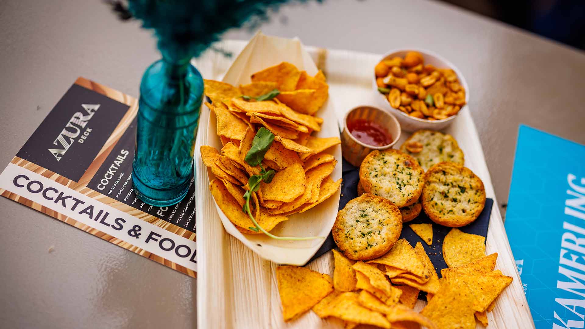 Gedurende de hele dag is er fingerfood beschikbaar in de Azura Deck-area. Daarnaast vind je in de directe omgeving een foodcourt met diverse culinaire opties.